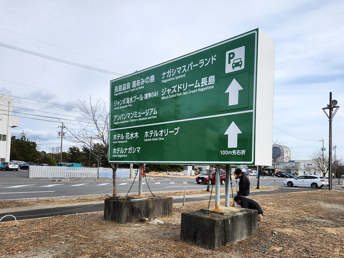 今回は、三重県桑名市のナガシマリゾート様の敷地内にて、既存の自立サインへ案内プレートの貼り替え施工を行いました。