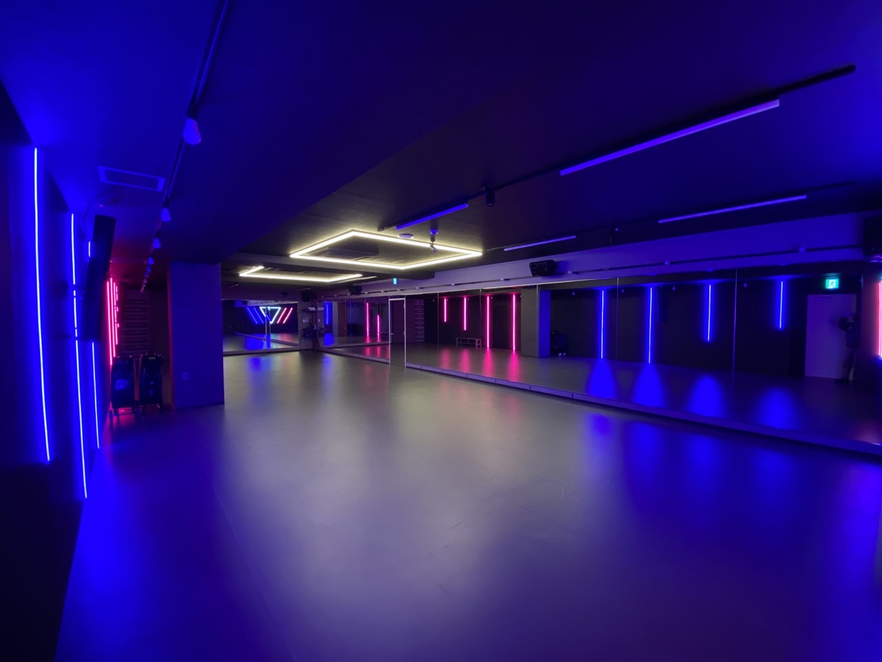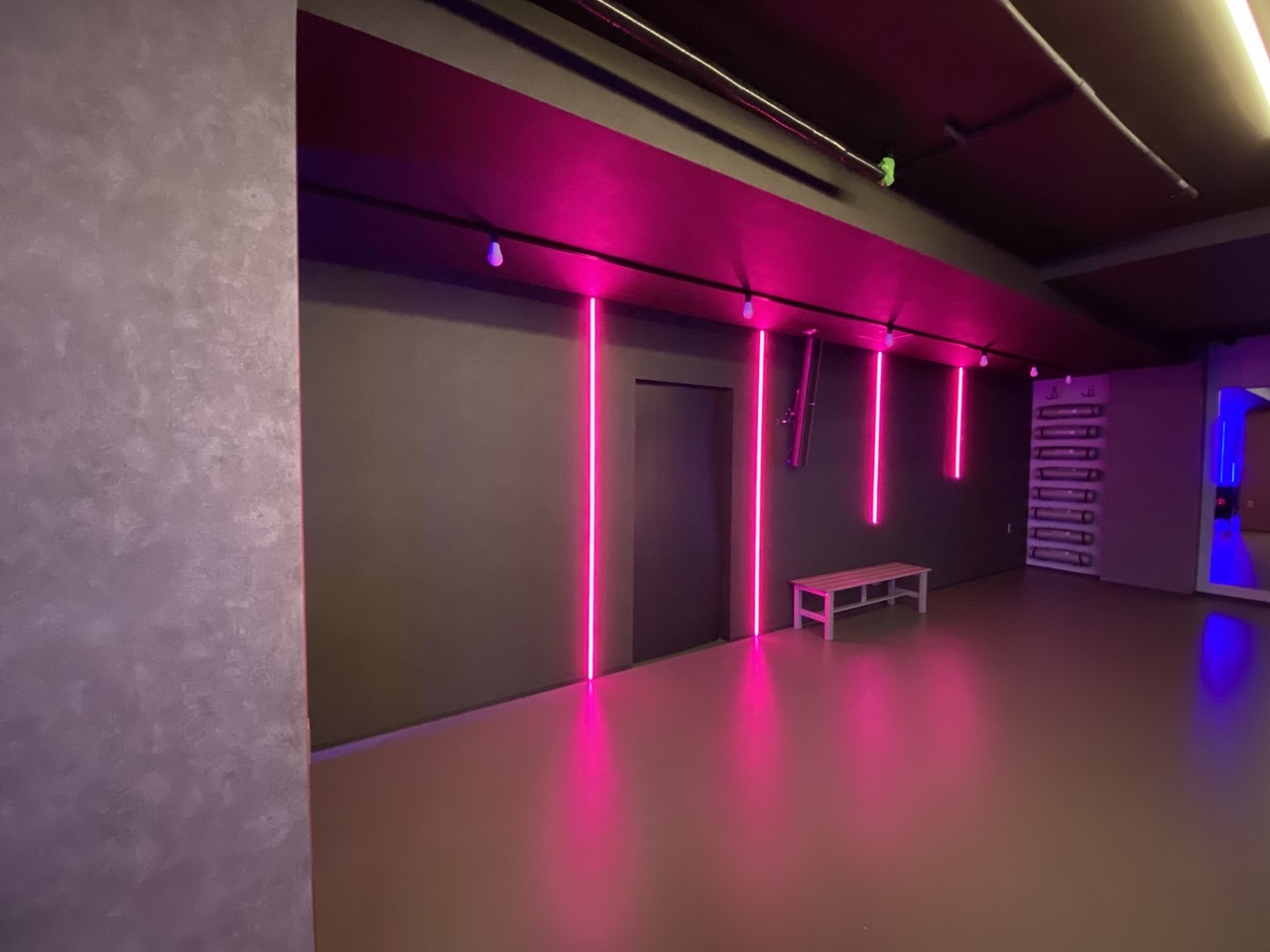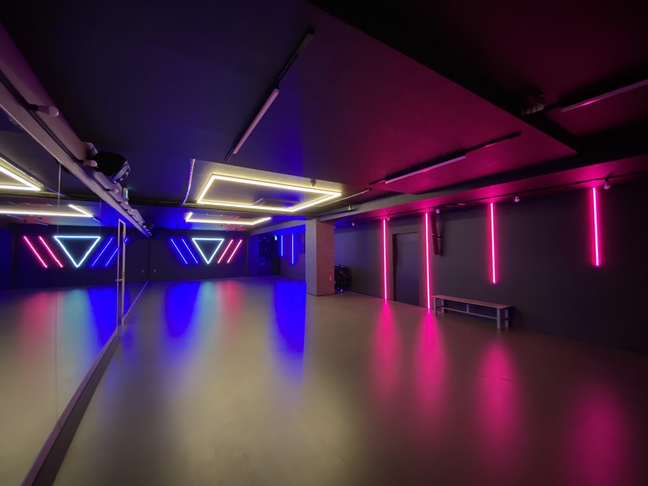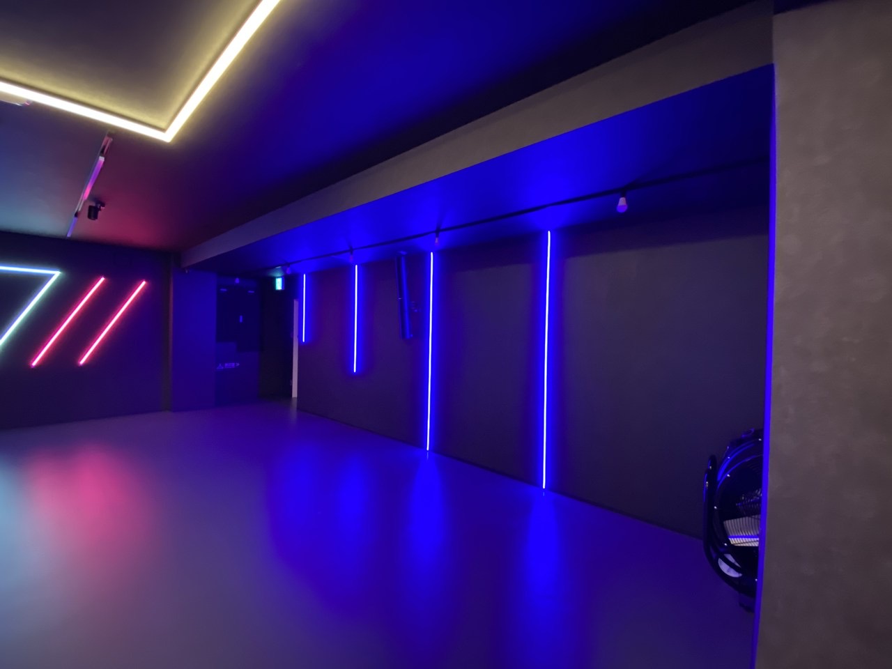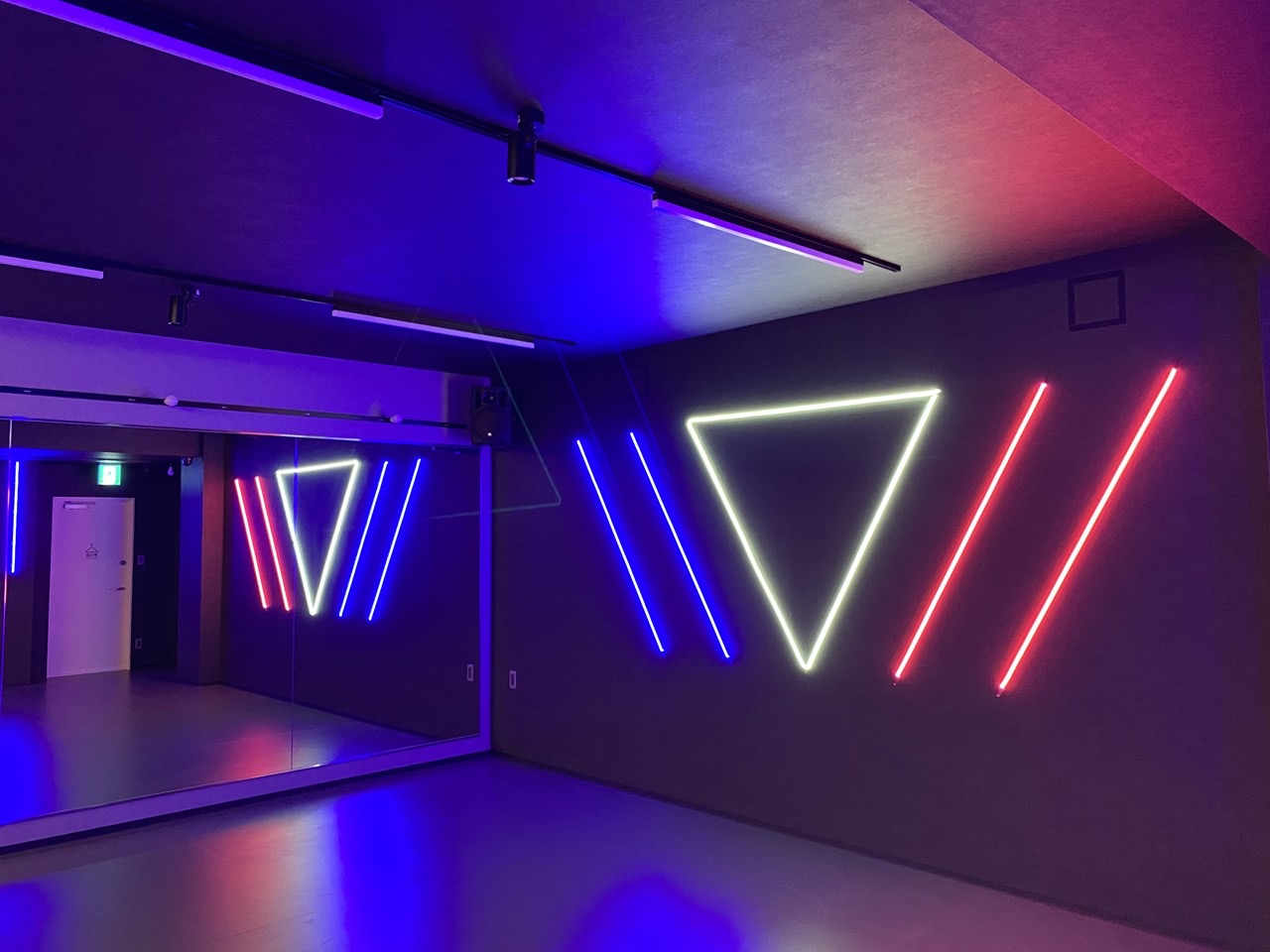 ネオンチューブの色鮮やかな発光が、スタジオの雰囲気を引き締め、利用者にとっても印象的な空間となっていますね。