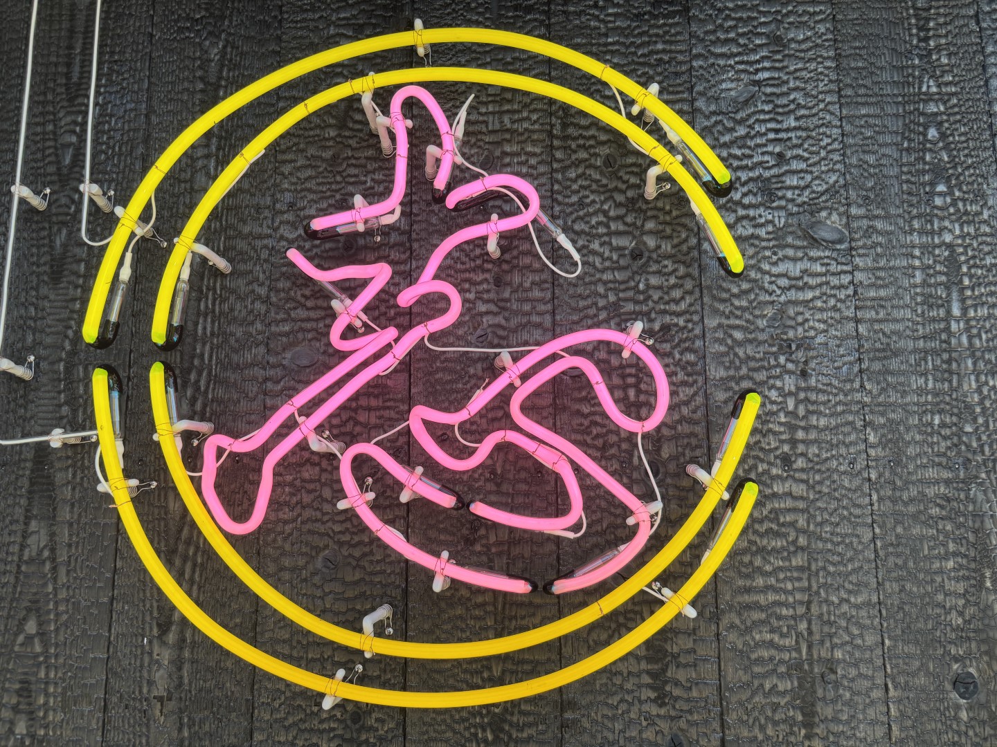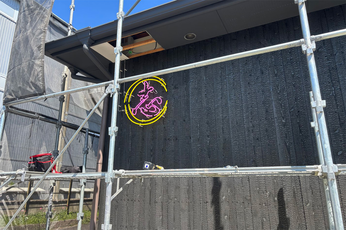 黒い焼き杉の外壁に、ピンクと黄色のネオンが鮮やかに映え、遠くからでも一目で目を引く仕上がりとなりました。