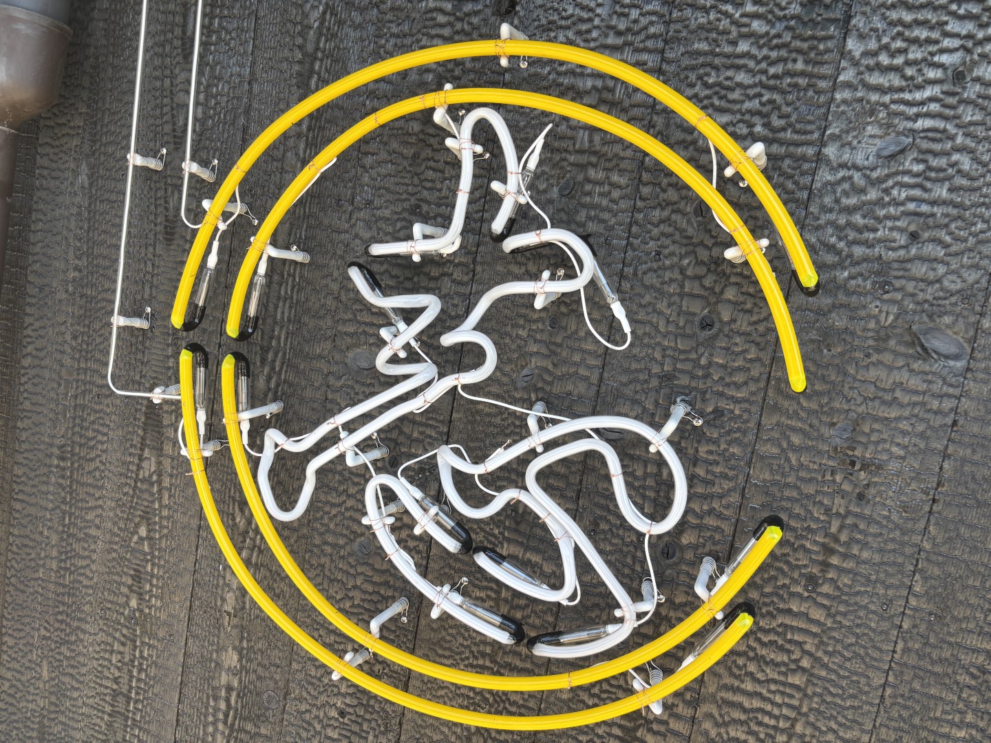 ネオン管は丁寧に曲げ加工を行い、図案に沿った美しいラインを再現。
