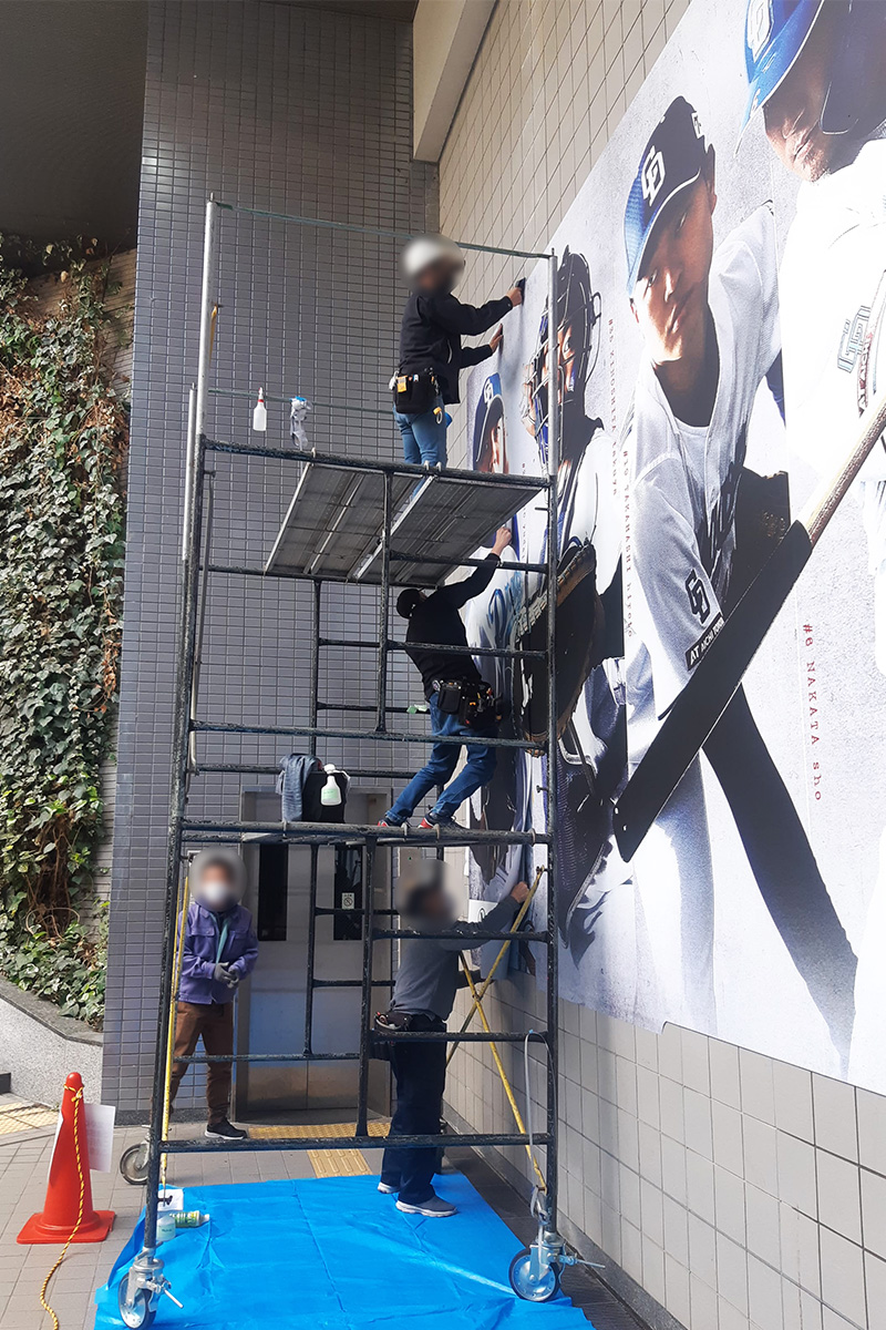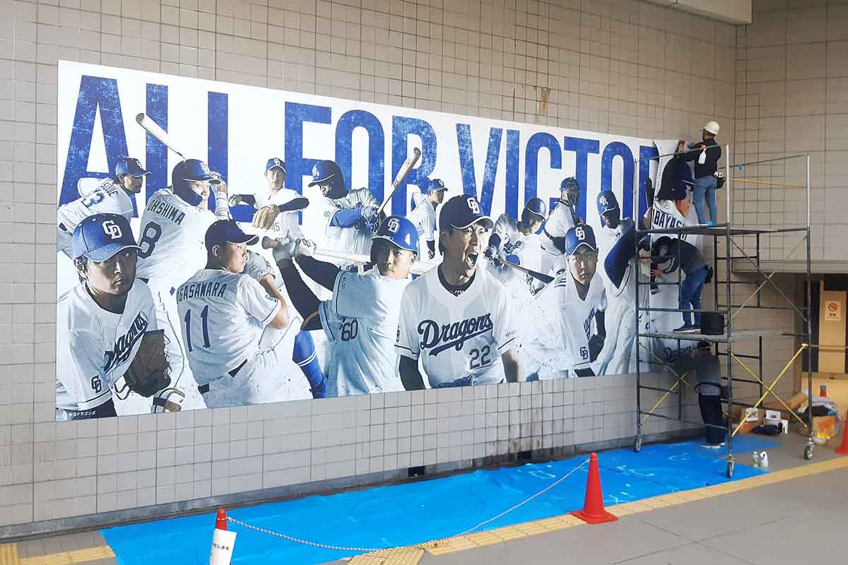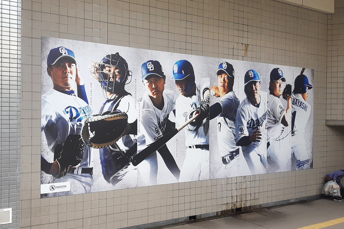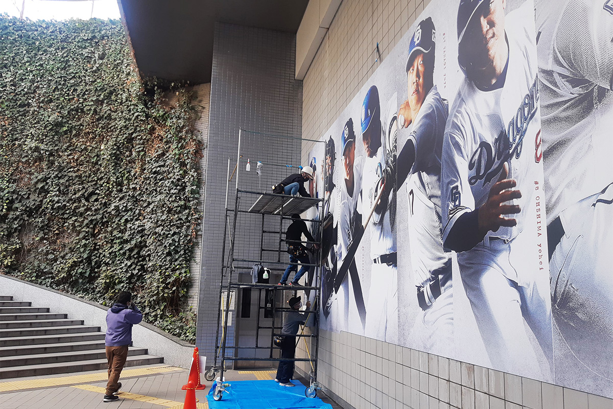 今回はナゴヤドーム前矢田駅にて、既存壁面サインに、新規出力シート貼り施工についてご紹介させて頂きます。