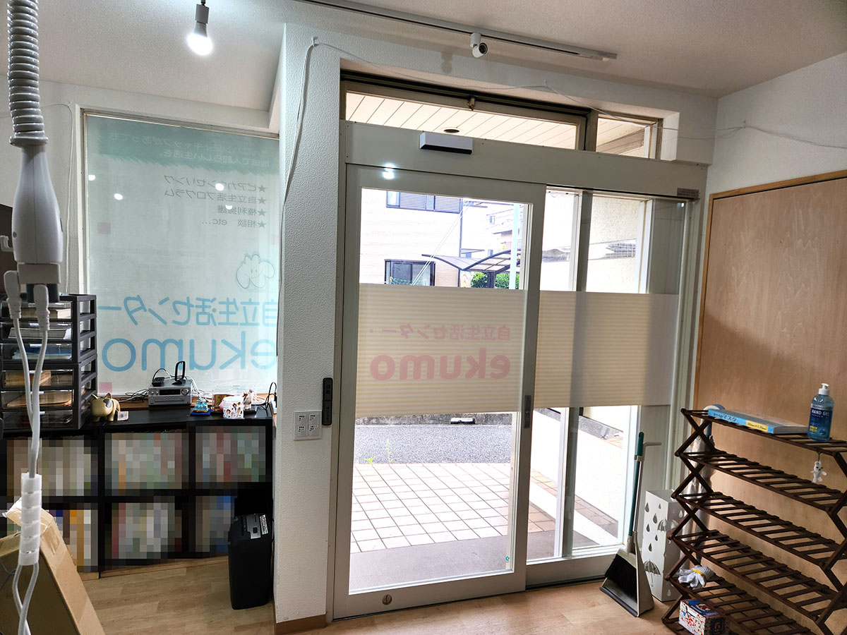 後ろからの写真を見ると分かりやすいですが、自動ドアの可動部と固定部の計2枚の施工となります。