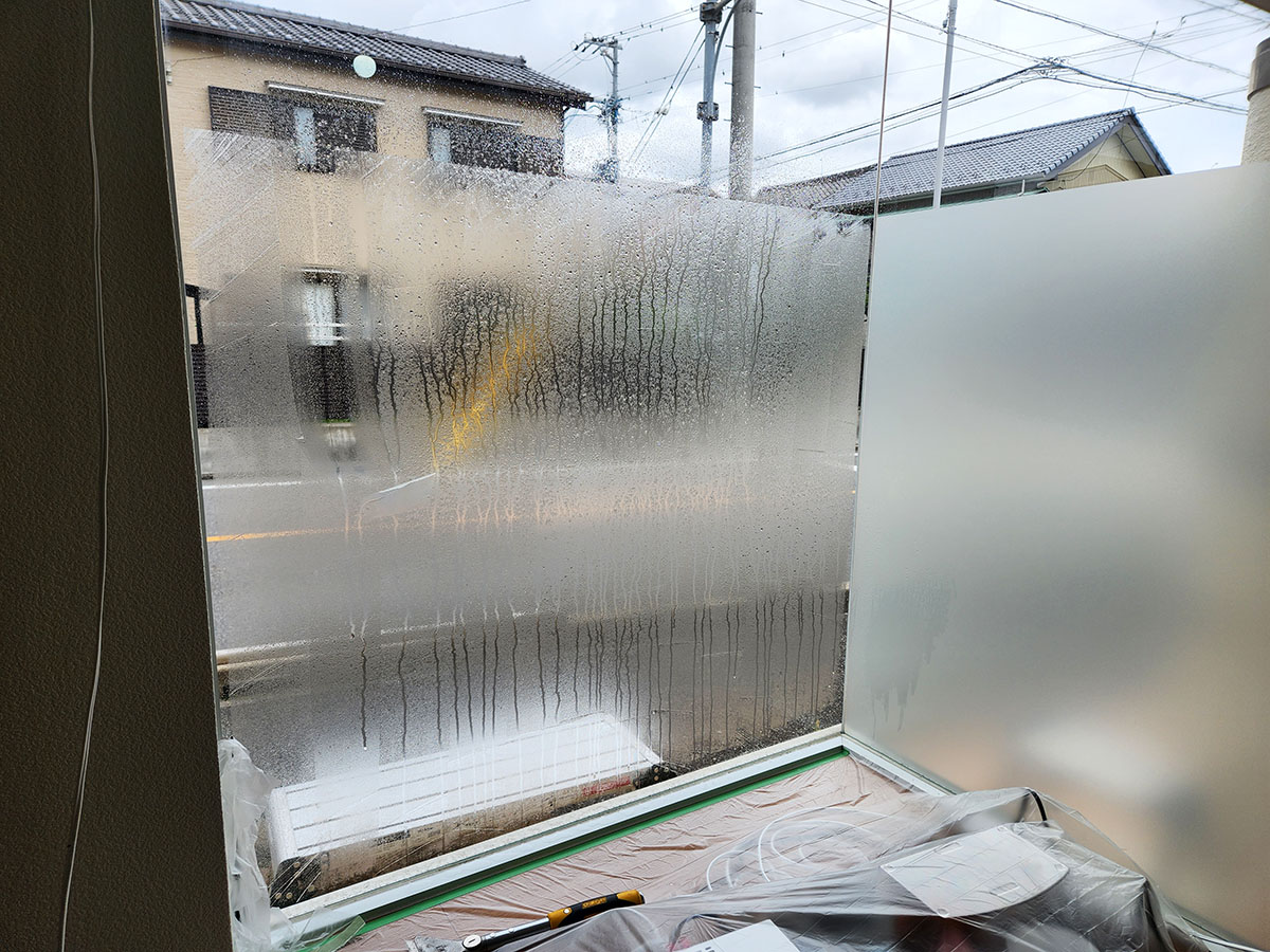 既存すりガラス調シートの剥離後、出力シート外貼り