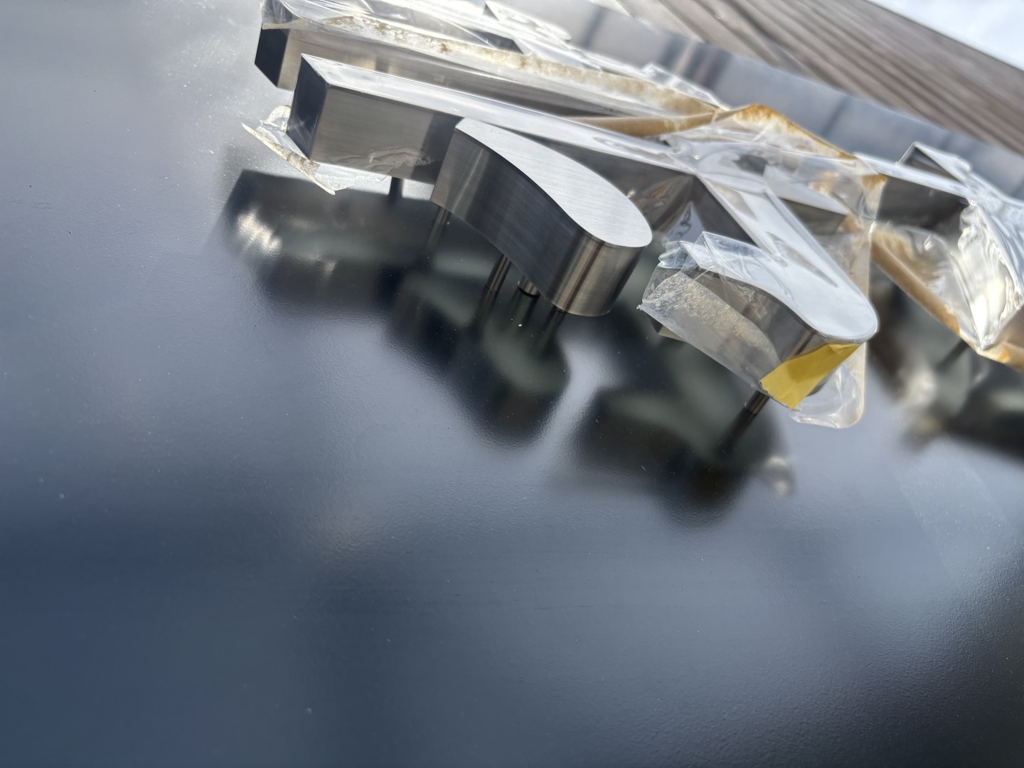 会社のロゴは、ウレタン塗装にて鮮やかなグリーンに、社名はヘアライン加工を施したスタイリッシュな仕上がりとなっております。