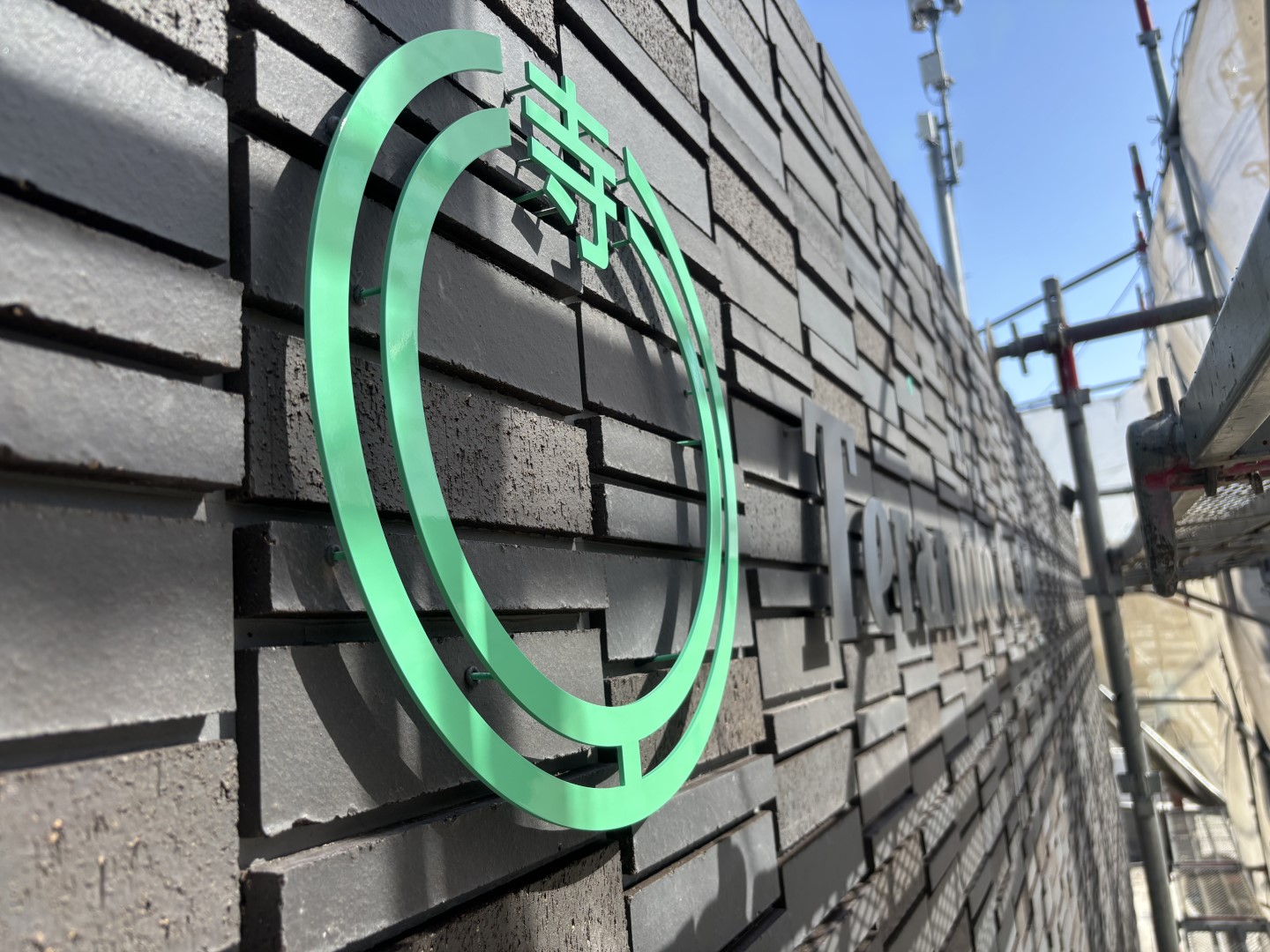 建物側面には、企業ロゴと英字社名を表現した金属切文字サインを取り付けました。