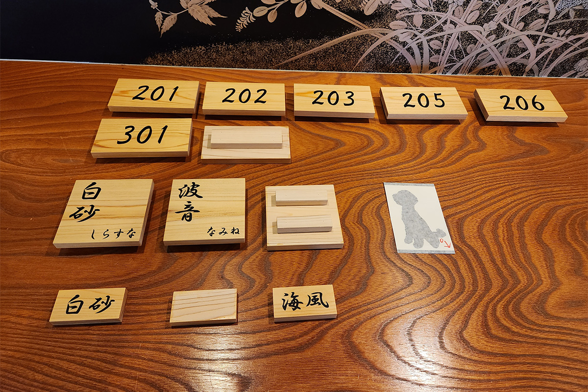 木の板にカッティングシートを貼り、室名札となるものは裏面に木材を取り付け、立体感を生み出しています。